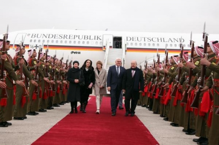 وكان في استقبال الرئيس الألماني، لدى وصوله مطار ماركا العسكري، وزير المياه والري حازم الناصر، رئيس بعثة الشرف المرافقة للضيف، وأمين عمان، ومحافظ العاصمة، والسفير الأردني في برلين، والسفيرة الألمانية في عمان وأركان السفارة، وعدد من المسؤولين المدنيين والعسكريين.