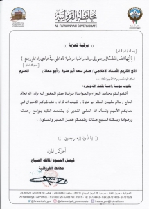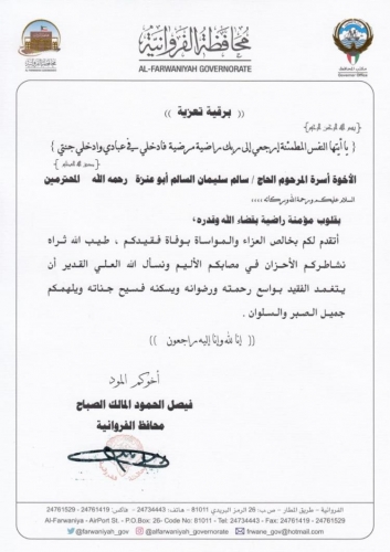 وجه محافظ الفروانية الشيخ فيصل الحمود المالك الصباح برقية تعزية لرئيس مجلس الادارة الاستاذ صخر ابو عنزة بوفاة عمه الحاج سالم سليمان السالم ابو عنزة ولاسرة الفقيد رحمه الله داعيا الله العلي القدير ان يتغمد الفقيد بواسع رحمته وان يسكنه فسيح جنانه .