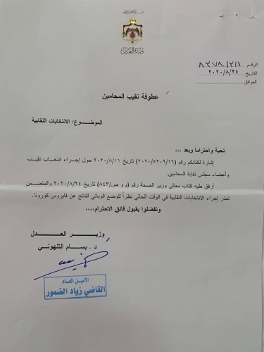 وارفق وزير العدل د.بسام التلهوني في الكتاب الذي وجهه لنقيب المحامين مازن رشيدات، نسخة من رد وزير الصحة د.سعد جابر على الكتاب الذي ارسلته النقابة لوزارة العدل وادارة الازمات والذي حددت فيه موعد انتخاباتها.