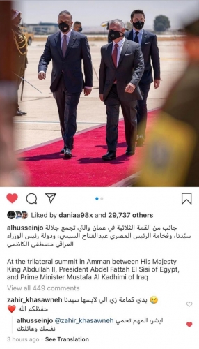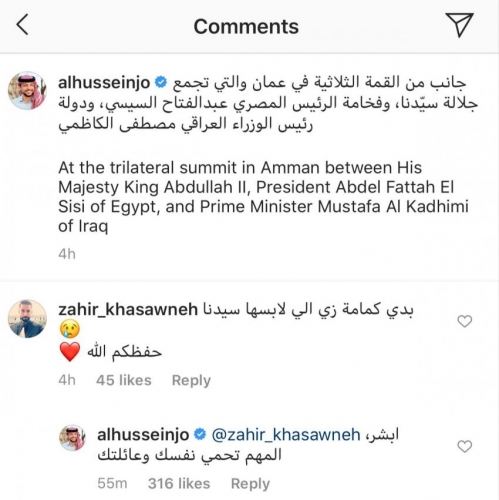 وجاء رد ولي العهد على المواطن بعد تعليق المواطن على صورة نشرها الأمير الحسين عبر حسابه الرسمي في موقع تبادل الصور انستغرام تجمعه وجلالة الملك ورئيس الوزراء العراقي مصطفى الكاظمي.