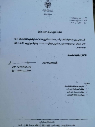 قرر وزير الداخلية سلامة حماد، الخميس، تمديد إغلاق معبر جابر الحدودي مع سوريا إلى يوم الاحد 30/8/2020.