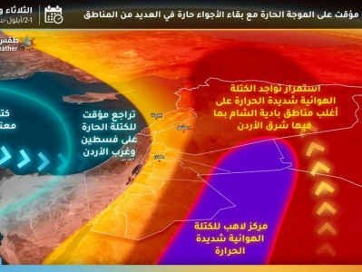 تعاود الكتلة الهوائية الحارة والجافة تعمقها في الأردن، اعتباراً من الخميس القادم لتصبح الـجواء حارة جداً في اغلب المناطق كما وتشير التحليلات الى استمرارية هذه الموجة الحارة حتى منتصف الاسبوع القادم.