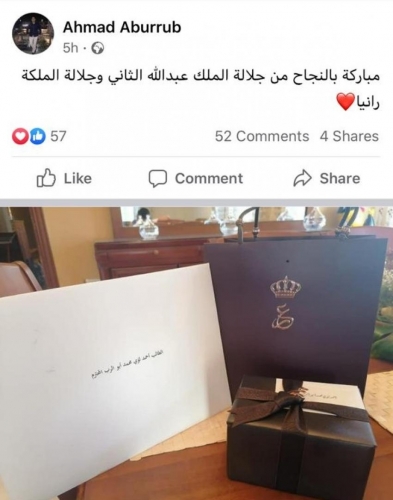ونشر الطالب الحاصل على معدل 100% في التوجيهي صورة الهدية ورسالة مرفقة.