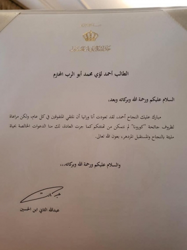 وكتب في الرسالة، "مبارك عليك النجاح أحمد، لقد تعودت أنا ورانيا أن نلتقي المتفوقين في كل عام، ولكن مراعاة لظروف جائحة كورونا لم نتمكن من تهنئتكم كما جرت العادة، لك منا الدعوات الخالصة بحياة مليئة بالنجاح والمستقبل المزدهر، بعون الله تعالى".