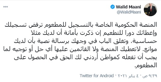 وعبر المعاني عن استغرابه قائلاً: "إن المنصة لاتعطيك ولا القائمين عليها أي حل أو توجيه لما يجب أن تفعله كمواطن أردني لك الحق في الحصول على المطعوم".