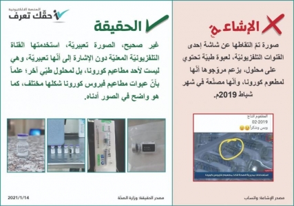 وقالت الوزارة في بيان لها عبر منصة حقك تعرف، الخميس: "غير صحيح، الصورة تعبيرية، استخدمتها القناة التلفزيونية المعنية دون الإشارة إلى أنها تعبيرية، وهي ليست لأحد مطاعيم كورونا، بل لمحلول طبي آخر"، مشيرة إلى أن عبوات مطاعيم فيروس كورونا شكلها مختلف.