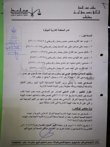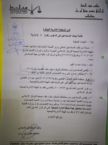 تقدم أعضاء من الهيئة الإدارية السابقة المنتخبة لجمعية المركز الإسلامي والتي تم حلها عام 2006 بقرار من وزارة التنمية الاجتماعية، بطعن لدى المحكمة الإدارية حول قرار وزير التنمية الاجتماعية أيمن المفلح بعدم إعادة عضويتهم للهيئة الإدارية رغم صدور قرار قضائي قطعي ببراءتهم من التهم الموجهة ضدهم آنذاك، معتبرين قرار الوزير مخالفا للقانون وتعسفاً في استعمال السلطة.