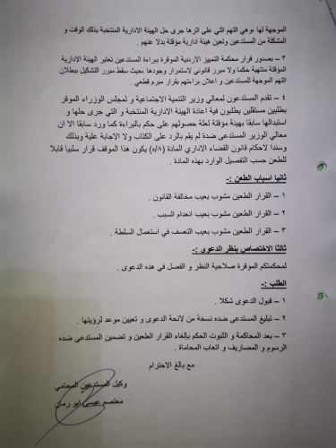 وأشار طلب الطعن إلى أن المستدعين تقدموا بطلب لكل من وزير التنمية الاجتماعية ولمجلس الوزراء لإعادة الهيئة الإدارية المنتخبة للجمعية والتي جرى حلها، وذلك بعد صدور قرار ببراءة أعضاءها مما وجه إليهم من تهم، لكن دون رد من الوزير.