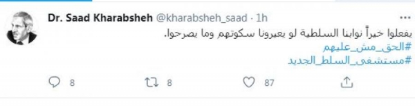 وقال الخرابشة، في تغريدة على تويتر: "يفعلوا خيراً نوابنا السلطية لو يعيرونا سكوتهم وما يصرحوا".