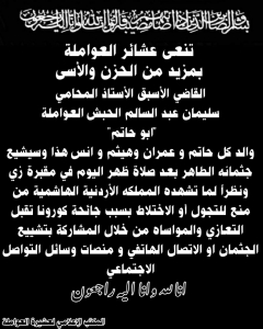 تنعى عشيرة العواملة بمزيد من الحزن والأسى القاضي الأسبق الأستاذ المحامي سليمان عبد السالم الحبش العواملة "ابو حاتم" والد كل من حاتم وعمران وهيثم وأنس.