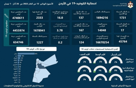 وبلغ عدد الحالات النشطة 1227 حالة مقارنة مع 2175 حالة خلال الأسبوع رقم 12 بانخفاض حوالي 43 بالمئة، كما بلغت نسبة الحالات في الفئة العمرية 10 - 17 عام، حوالي 7 بالمئة مقارنة مع 10 بالمئة خلال الأسبوع السابق، مبينا ان نسبة إصابة الفئة العمرية 6 -9 سنوات بلغت 1 بالمئة مقارنة مع 2 بالمئة في الأسبوع الذي سبقه.