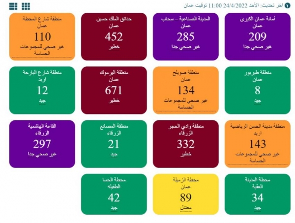 وبين المؤشر أن منطقة أمانة عمان الكبرى، والمدينة الصناعية في سحاب، والقاعة الهاشمية في الزرقاء جودة الهواء بها غير صحي جدا.