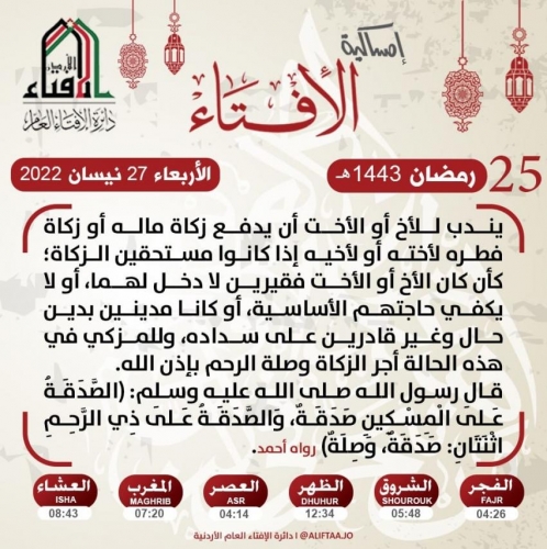 واوضحت الإفتاء الأربعاء، في امساكية اليوم الخامس والعشرين من شهر رمضان المبارك: "يندب للأخ أو الأخت ان يدفع زكاة ماله أو زكاة فطره لأخته أو لأخيه إذا كانوا مستحقين الزكاة، كأن كان الأخ او الاخت فقيرين لا دخل لهما، أو لا يكفي حاجتهما الأساسية، أو كانا مدينين بدين حال وغير قادرين على سداده، وللمُزكي في هذه الحالة أجر الزكاة وصلة الرحم بإذن الله".