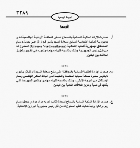 كما صدرت ارادة ملكية سامية بالموافقة على منح ارانثاثو بانيون دابالوس سفيرة مملكة اسبانيا المعتمدة والمقيمة لدى البلاط الملكي الهاشمي وسام الاستقلال من الدرجة الأولى، وذلك بمناسبة انتهاء مهامها وتقديرا لجهودها التي بذلتها في تنمية وتعزيز العلاقات الثنائية بين البلدين.