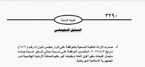 الرأي نيوز - صدرت الإرادة الملكية السامية بالموافقة على قرار مجلس الوزراء المتضمن الموافقة على تسمية السفيرة جمانة غنيمات سفيرا فوق العادة ومفوضا غير مقيم للمملكة الأردنية الهاشمية لدى الجمهورية الاسلامية الموريتانية.
