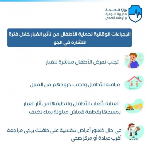 وقدمت المديرية عددا من الإجراءات الوقائية لحماية الأطفال من تأثير الغبار خلال فترة انتشاره في الجو: