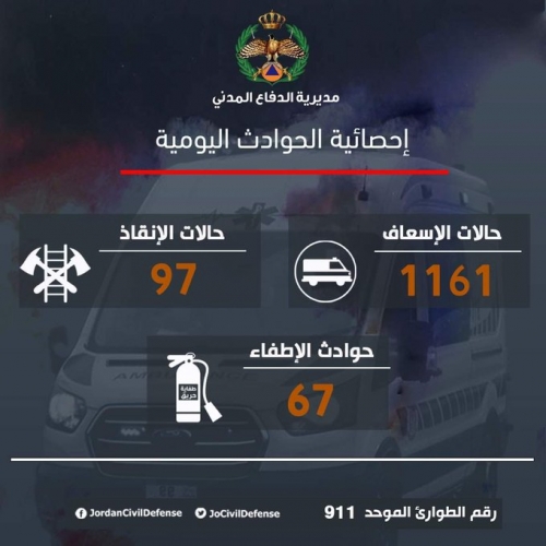 وأضافت المديرية أنها تعاملت مع 97 حادث إنقاذ، و67 حادث إطفاء.