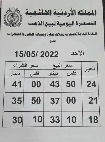 وبلغ سعر بيع الغرام الواحد من الذهب عياري 24 و18 لغايات الشراء من محلات الصاغة 43.50 دينارًا و 33.10 دينارا على التوالي.