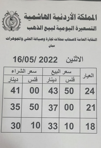 وبلغ سعر بيع الغرام الواحد من الذهب عياري 24 و18 لغايات الشراء من محلات الصاغة 43.50 دينارًا و 33.10 دينارا على التوالي.
