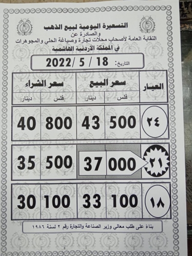 وكما بلغ سعر بيع الغرام الواحد من الذهب عياري 24 و18 لغايات الشراء من محلات الصاغة 43.5 دينارا و 33.10 دينارا على التوالي.