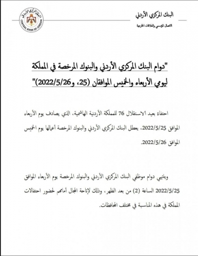الرأي نيوز - أعلن البنك المركزي الأردني، اليوم الاثنين، دوام البنك المركزي الأردني والبنوك المرخصة في المملكة ليومي الأربعاء والخميس الموافقان ٢٥ و٢٠٢٢/٥/٢٦.
