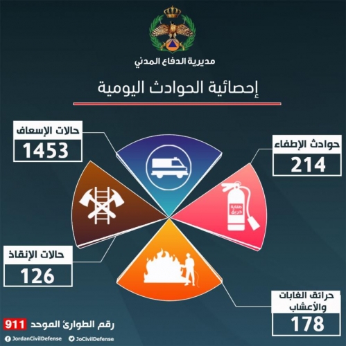 وبينت المديرية في منشور لها عبر فيسبوك اليوم الاثنين، أنها تعاملت مع (126) حادث إنقاذ، و(214) حادث إطفاء و(178) حرائق أعشاب جافة.