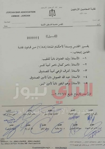 وتم خلال الجلسة اختيار المحامي وليد العدوان نائبا للنقيب والمحامي ناصر كمال امينا للسر والمحامي اشرف الزعبي امينا للصندوق والمحامي عبدالله العموش نائبا لامين الصندوق والمحامي برهم البقور نائبا لامين السر.
