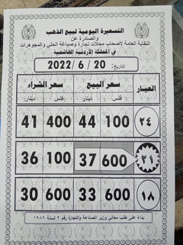 وبلغ سعر الذهب عيار 21 الأكثر طلبا من قبل المواطنين 37.60 دينارا للغرام لجهة البيع للمواطنين مقابل 36.10 لجهة الشراء منهم.