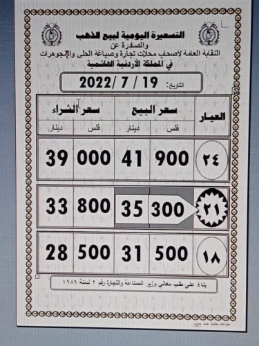 وبلغ سعر غرام الذهب عيار 21 الاكثر طلبا لدى الاردنيين في السوق المحلي 35.30 دينارا لجهة الشراء و 33.80 لجهة البيع.