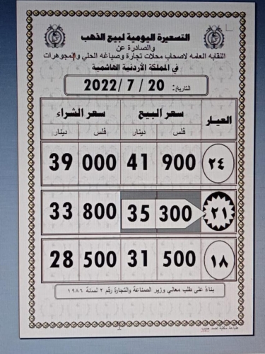 سعر المحلي غرام الذهب عيار 21 الاكثر طلبا لدى الاردنيين في السوق 35.30 دينار لوجه الشراء و 33.80 لجهة البيع.