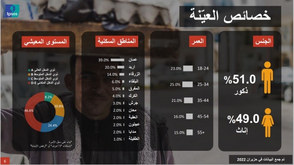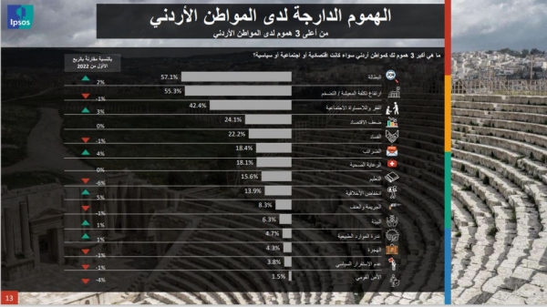 وبحسب (إبسوس) فإن ما يقارب من 7 من كل 10 أردنيين لديهم نظرة سلبية تجاه الوضع الاقتصادي الحالي في الأردن.وذلك نتيجة التخوف من البطالة والتضخم.