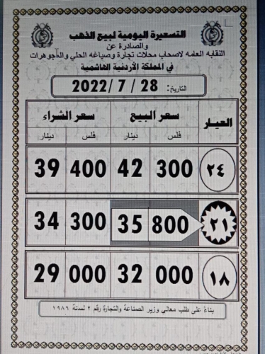 ووفق التسعيرة بلغ سعر الذهب عيار 21 الأكثر رغبة لدى المواطنين 35.80 دينارا، فيما وصل سعر بيع الذهب عيار 24 إلى 42.30 دينارا وعيار 18 إلى 32 دينارا.