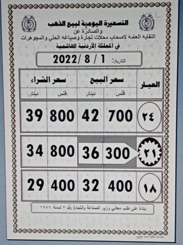 ووفق التسعيرة بلغ سعر شراء الذهب عيار 21 الأكثر رغبة لدى المواطنين 36.30 دينارا و 34.80 لجهة البيع للصاغة، فيما وصل سعر بيع الذهب عيار 24 إلى 42.70 دينارا وعيار 18 إلى 32.40 دينارا.
