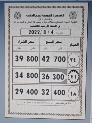 وبلغ سعر شراء غرام الذهب عيار 21 وهو الاكثر رغبة بين المواطنين 36.30 دينارا، فيما بلغ سعر البيع للصاغة 34.80.