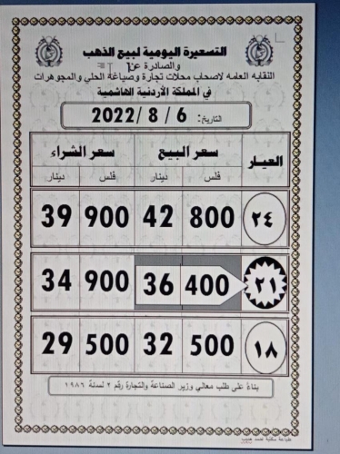 وبلغ سعر شراء غرام الذهب عيار 21 وهو الاكثر رغبة بين المواطنين 36.40 دينارا، فيما بلغ سعر البيع للصاغة 34.90.