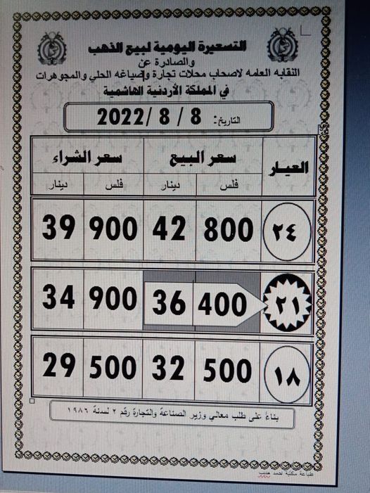وبلغ سعر بيع غرام الذهب عيار 21 الأكثر رغبة من الأردنيين بالسوق المحلية عند 36,40 دينارا لغايات شراء المواطنين من محلات الصاغة.