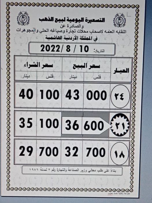 وبلغ سعر بيع غرام الذهب عيار 21 الأكثر رغبة من الأردنيين بالسوق المحلية عند 36,60 دينارا لغايات شراء المواطنين من محلات الصاغة.