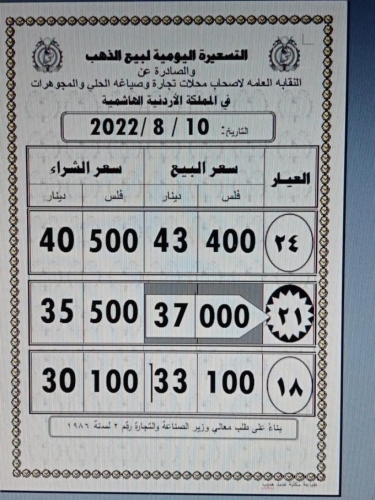 كما بلغ سعر الغرام من الذهب عياري 24 و18 لغايات الشراء من محلات الصاغة عند 43.40 و 33.10 دينارا على التوالي.