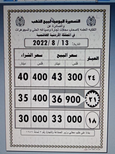 كما بلغ سعر الغرام من الذهب عياري 24 و18 لغايات الشراء من محلات الصاغة عند 43.30 و 33.0 دينارا على التوالي.