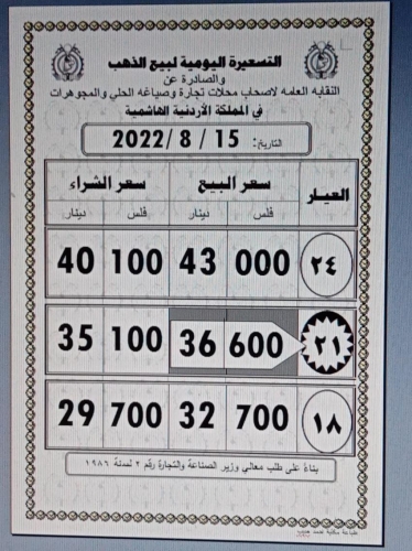كما بلغ سعر الغرام من الذهب عياري 24 و18 لغايات الشراء من محلات الصاغة عند 43.0 و 32.70 دينارا على التوالي.