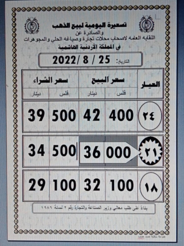 وبلغ سعر غرام الذهب عيار 21 الاكثر طلبا عند 36.00 دينارا لجهة البيع للمواطنين، مقابل 34.50 دينارا لجهة الشراء .