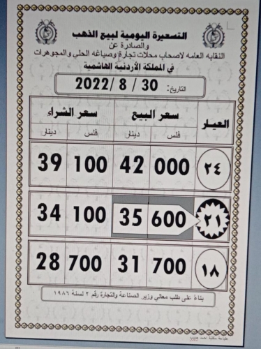 أسعار الذهب في الأردن الثلاثاء