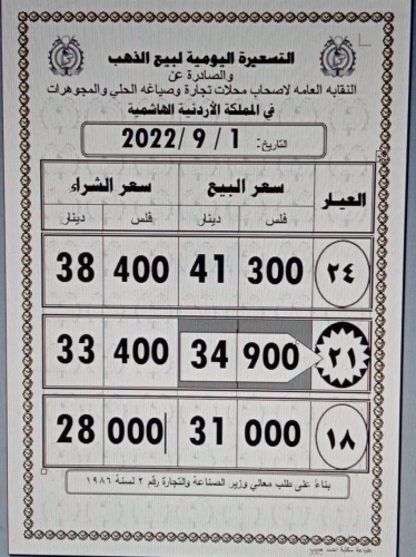 وبلغ سعر غرام الذهب عيار 21 الاكثر طلبا عند 34.90 دينارا لجهة البيع للمواطنين، مقابل 33.40 دينارا لجهة الشراء .