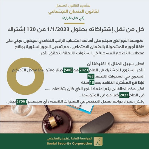 ولغايات توضيح آلية الاحتساب طرحت المؤسسة مثالاً افترضت فيه أن الأجر السنوي للمشترك في العام (٢٠٢٣) هو ( 500 ) دينار ومتوسط معدل التضخم السنوي في السنوات اللاحقة( 3 %) ، فإذا قرر المشترك التقاعد بعد (15) سنة، ففي هذه الحالة لن يتم اعتماد الأجر الذي كان يتقاضاه في العام (٢٠٢٣) كما هو في المتوسط، ولكن سيتم زيادته بواقع معدل التضخم في السنوات اللاحقة، أي سيصبح ( 756 ) دينار بدلا من ( 500 ) دينار.