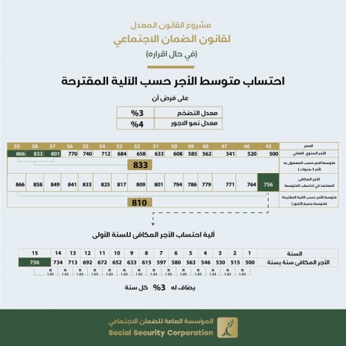 وفي التوضيح، بينت المؤسسة أن متوسط الأجر الذي سيتم على أساسه احتساب الراتب التقاعدي سيكون مبنياً على كافة أجور المؤمن عليه المشمولة بالضمان الاجتماعي، مع تعديل الأجور السنوية بواقع معدلات التضخم المسجلة في السنوات اللاحقة لتحقق الأجر. فالأجور السابقة التي تدخل في احتساب المتوسط سيتم تعديلها على نحو يعكس قوتها الشرائية عند التقاعد وذلك استنادا لمعدلات التضخم في كل سنة من السنوات اللاحقة لشمولها.