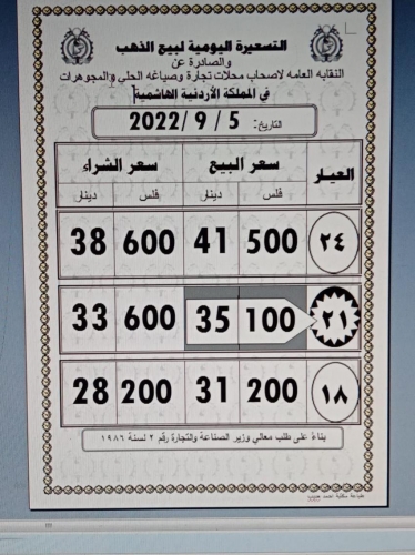 وبلغ سعر غرام الذهب عيار 21 الاكثر طلبا عند 35.10 دينارا لجهة البيع للمواطنين، مقابل 33.60 دينارا لجهة الشراء .