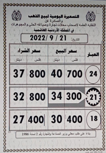 وبلغ سعر غرام الذهب من عيار 21 الاكثر طلبا لدى المواطنين 34.30 دينارا، فيما بلغ سعر غرام الذهب عيار 24 عند 40.70 دينارا.