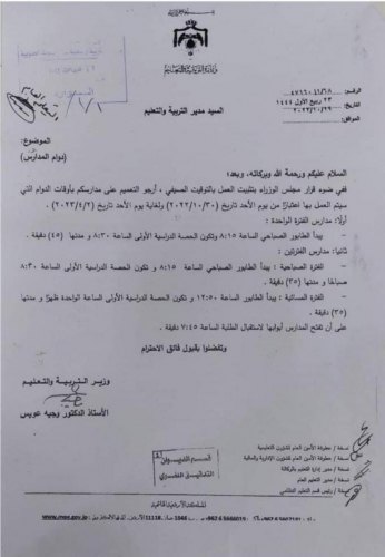 وجاء في التعميم، الذي حصلت وكالة الأنباء الأردنية (بترا)، على نسخة منه والصادر اليوم، أنه سيتم اعتبارا من يوم الأحد الموافق 30/10/2022، وحتى يوم الأحد 2/4/2023 تغيير دوام المدارس ليصبح على النحو الآتي: الفترة الواحدة، الطابور الصباحي في 8:15 والحصة الأولى 8:30 ومدة الحصة 45 دقيقة، والفترتين: الصباحية، الطابور الصباحي 8:15 والحصة الأولى 8:30 ومدة الحصلة 35 دقيقة، والمسائية، الطابور الساعة 12:50، والحصة الأولى الساعة 1:00 ومدة الحصة 35 دقيقة.