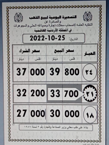 وبلغ سعر غرام الذهب 21 الأكثر رغبة لدى المواطنين عند 33.70 دينارا للشراء ، و 32.20 دينارا لغاية البيع لمحال الصاغة.