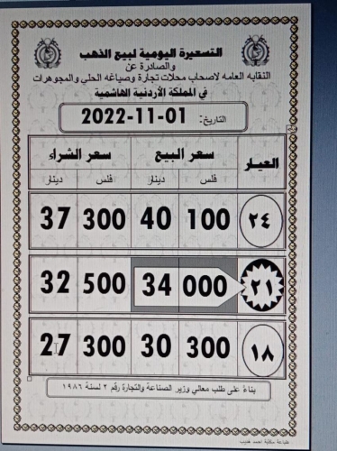 وبلغ سعر شراء الغرام الواحد من عيار 21 ، الأكثر طلبا بين الأردنيين 34.00 دينارا فيما بلغ سعر البيع للصاغة 32.50 دينارا.